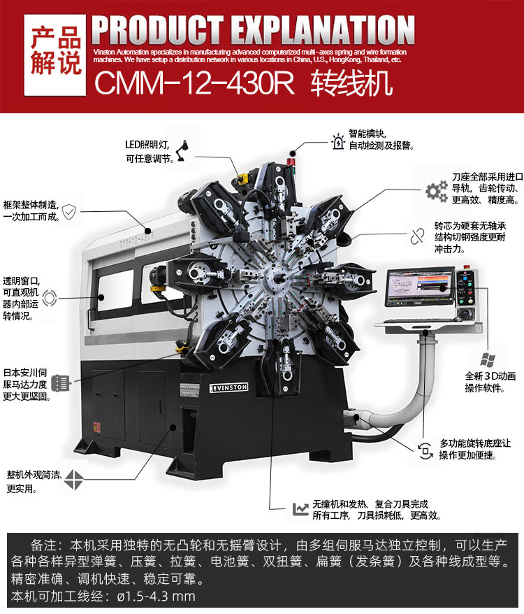 • 產(chǎn)品概述: CMM-12-430R轉(zhuǎn)線機(jī),彈簧機(jī) 可生產(chǎn)?1.5-4.3 mm線徑彈簧及線成形等)本機(jī)采用獨(dú)特的無凸輪和無搖臂設(shè)計(jì),由多組伺服馬達(dá)獨(dú)立控制,可以生產(chǎn)各種各樣異型彈簧、壓簧、拉簧、雙扭簧、電池簧、扁簧(發(fā)條簧)及各種線成型等。精密準(zhǔn)確、調(diào)機(jī)快速、穩(wěn)定可靠。