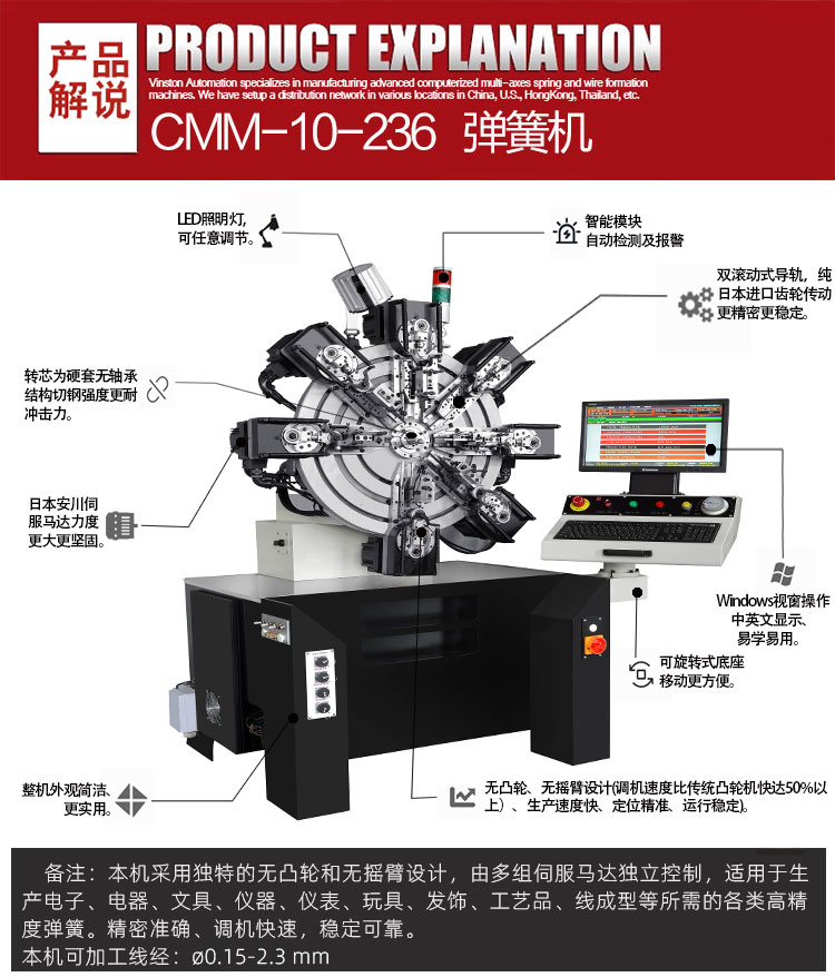 • 產(chǎn)品概述: CMM-10-236電腦彈簧機(jī) 可生產(chǎn)?0.15-2.3 mm線徑彈簧及線成形等)本機(jī)采用獨(dú)特的無凸輪和無搖臂設(shè)計(jì),由多組伺服馬達(dá)獨(dú)立控制,可以生產(chǎn)各種各樣異型彈簧、壓簧、雙扭簧、電池簧、扁簧(發(fā)條簧)及各種線成型等。精密準(zhǔn)確、調(diào)機(jī)快速、穩(wěn)定可靠。