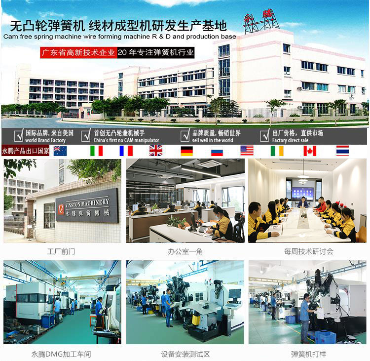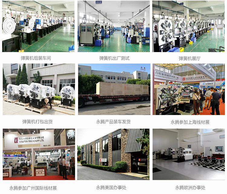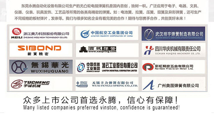 東莞永騰自動(dòng)化設(shè)備有限公司(vinston)是一家專業(yè)生產(chǎn)CNC多軸多功能無(wú)凸輪電腦彈簧機(jī)、線材成型機(jī)和銅鋁排折彎?rùn)C(jī)的美國(guó)獨(dú)資企業(yè)。本公司從2001年開(kāi)始運(yùn)用美國(guó)先進(jìn)的伺服控制技術(shù)進(jìn)行一次具有重要意義的技術(shù)改革,打破傳統(tǒng)的凸輪帶動(dòng)成型模式,成為行業(yè)創(chuàng)新的無(wú)凸輪模式兼?zhèn)錂C(jī)械手的彈簧機(jī)。可加工線徑0.15-12mm范圍彈簧及線材成型。