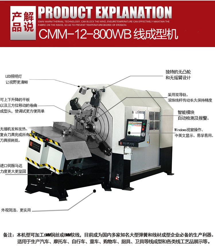 五、永騰線材折彎機CMM-12-800WB機加工區(qū)域能上下左右前后移動成型,以及穩(wěn)定桿的輔助支撐作用,確保該機比其他平板線成型機生產(chǎn)更穩(wěn)定、更快速。
