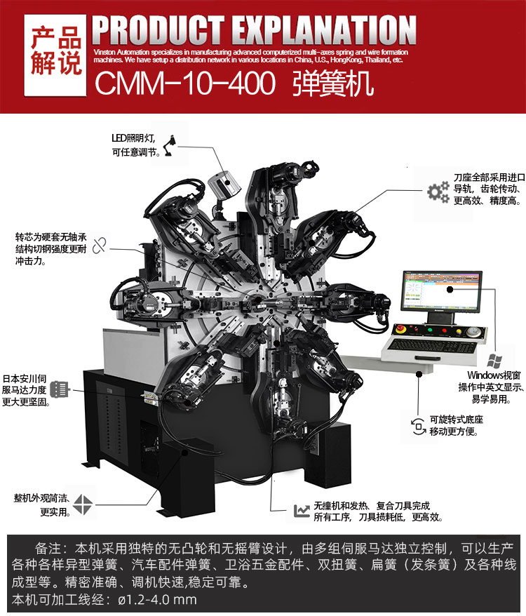 本機型適用于生產(chǎn)汽車、摩托車、自行車等車輛及娛樂健身器材所需的高精密彈簧的生產(chǎn)。