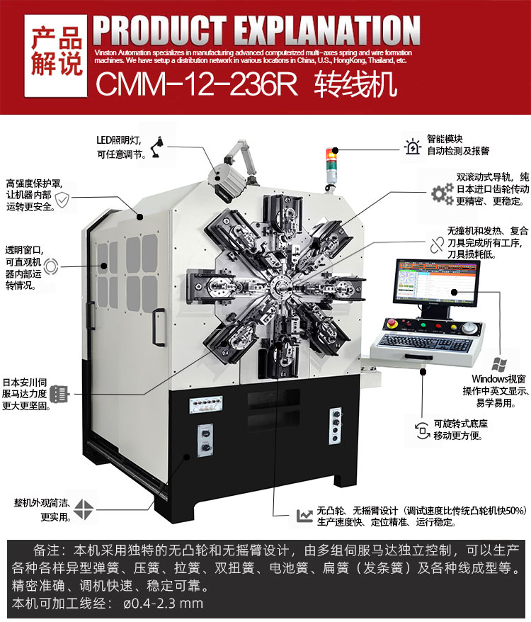• 產(chǎn)品概述: CMM-12-236R 轉(zhuǎn)線彈簧機(jī).可生產(chǎn)?0.4-2.3 mm線徑彈簧及線成形等)本機(jī)采用獨(dú)特的無凸輪和無搖臂設(shè)計(jì),由多組伺服馬達(dá)獨(dú)立控制,可以生產(chǎn)各種各樣異型彈簧、壓簧、拉簧、雙扭簧、電池簧、扁簧(發(fā)條簧)及各種線成型等。精密準(zhǔn)確、調(diào)機(jī)快速、穩(wěn)定可靠。