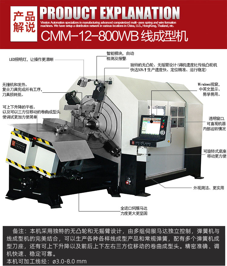 - 產(chǎn)品概述: CMM-12-800WB線材成型機(jī)可生產(chǎn)?3.0-8.0 mm線經(jīng)線成型)本機(jī)采用獨(dú)特的無(wú)凸輪和無(wú)搖臂設(shè)計(jì),由多組伺服馬達(dá)獨(dú)立控制,彈簧機(jī)與線成型機(jī)的完美結(jié)合,可以生產(chǎn)各種各樣線成型產(chǎn)品和常規(guī)彈簧,配有多個(gè)彈簧機(jī)成型刀座,還有可上下升降以及前后上下左右三方位移動(dòng)的卷曲成型頭。精密準(zhǔn)確、調(diào)機(jī)快速、穩(wěn)定可靠。
