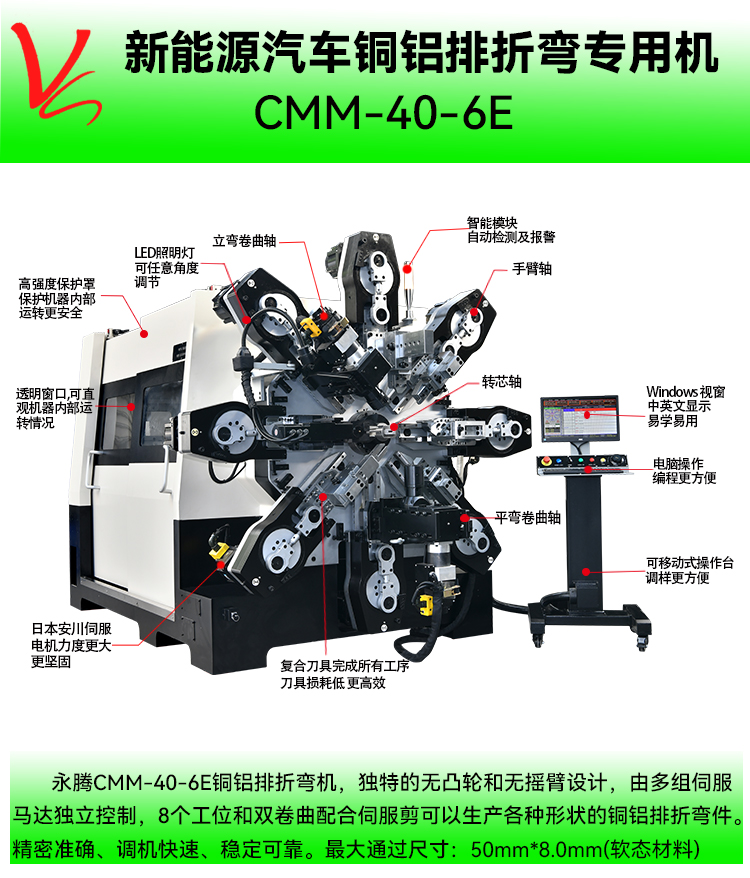 • 產(chǎn)品概述: CMM-40-6E銅排折彎?rùn)C(jī)(最大通過尺寸:50mm*8.0mm)集3D折彎?rùn)C(jī)和彈簧機(jī)所有的功能于一體的多功能專用機(jī),本機(jī)采用獨(dú)特的無凸輪和無搖臂設(shè)計(jì),由多組伺服馬達(dá)獨(dú)立控制,永騰銅排折彎?rùn)C(jī)廣泛應(yīng)用于導(dǎo)電排成型,新能源電池連接排、新能源電池模組、銅母排成型、硬排成型、導(dǎo)電排、電池連接排、銅排、裸排成型等。精密準(zhǔn)確、調(diào)機(jī)快速、穩(wěn)定可靠。