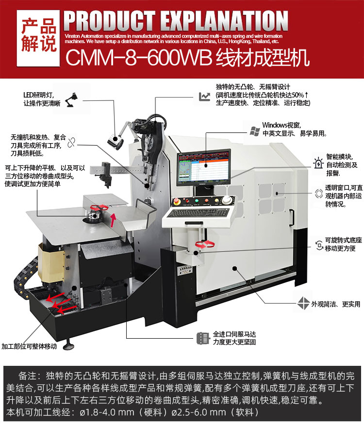 - 產(chǎn)品概述: CMM-8-600WB 線材成型機(jī)可生產(chǎn)?1.8-4.0 mm線經(jīng)鐵線或者低碳鋼可做?2.5-6.0 mm,本機(jī)專業(yè)生產(chǎn)汽車零部件等線成型,特別適合做大桿件汽車五金線材成型產(chǎn)品帶平板的線材折彎成型機(jī),既具備精密彈簧機(jī)的精度,又超越普通線成型機(jī)的速度,生產(chǎn)汽車零部件和廚衛(wèi)五金制品以及其他日用五金制品非常適合。具有設(shè)計(jì)直觀,調(diào)試方便,速度快的亮點(diǎn)。