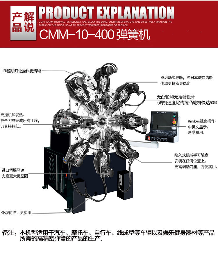獨(dú)特的無凸輪和無搖臂設(shè)計(jì),由多組伺服馬達(dá)獨(dú)立控制,可以生產(chǎn)各種各樣異型彈簧、壓簧、雙扭簧、電池簧、扁簧(發(fā)條簧)及各種線成型等。精密準(zhǔn)確、調(diào)機(jī)快速、穩(wěn)定可靠。