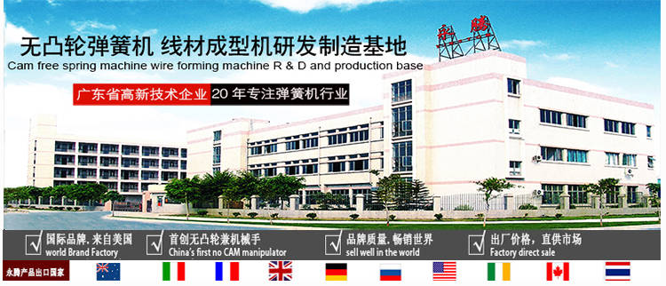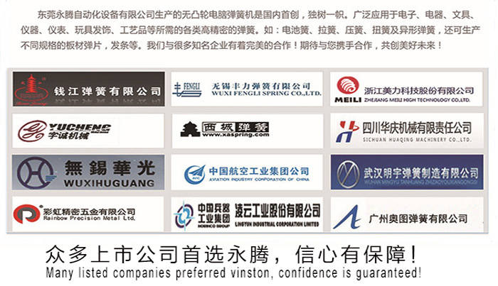 東莞永騰自動化設備有限公司是一家專業(yè)生產(chǎn)CNC多軸多功能無凸輪電腦彈簧機、線材成型機的美國獨資企業(yè)。本公司從2001年開始運用美國先進的伺服控制技術進行一次具有重要意義的技術改革,打破傳統(tǒng)的凸輪帶動成型模式,成為行業(yè)創(chuàng)新的無凸輪模式兼?zhèn)錂C械手的彈簧機。可加工線徑0.15-12mm范圍彈簧及線材成型。