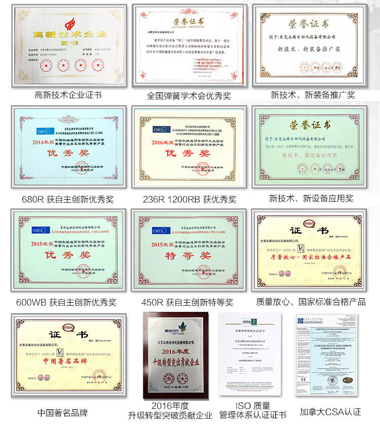 永騰彈簧機系列機型現(xiàn)已獲國內外專利局多項實用型專利。它調試快速、省時、省電,回報快。經(jīng)過長時間的生產(chǎn)實踐和多名美籍資深高級工程師設計并監(jiān)制,現(xiàn)已推出下列彈簧機: